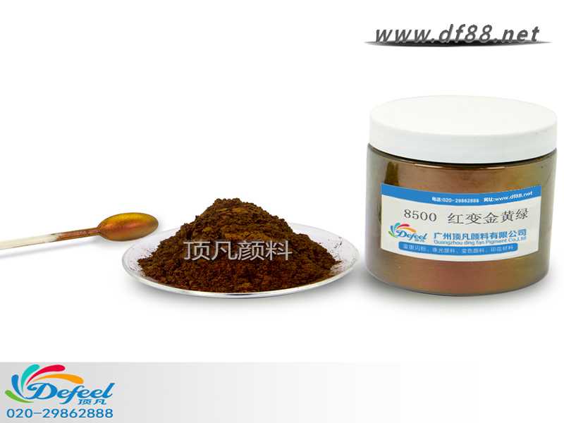 8500 紅變金黃綠變色龍粉可應(yīng)用于涂料、油墨、塑料各產(chǎn)業(yè),產(chǎn)品之設(shè)計大多以室內(nèi)(無紫外光之環(huán)境)與室外(有紫外光之環(huán)境)有顏色變化為訴求。