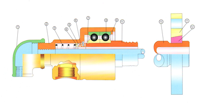 1.彎頭 2.殼體 3.彈簧 4.彈簧墊片 5.輔助密封圈 6.密封環 7.軸用擋圈 8.軸承 9.孔用擋圈 10.外管 11.快環法蘭 12.半分環 |